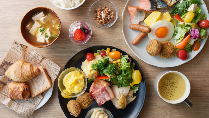 丰富的蔬菜和水果,搭配盐麹,豆乳等有助于调节肠道环境的食材,以及能随时品尝到现做美味的现场厨房,为您带来身心放松的晨间时光。